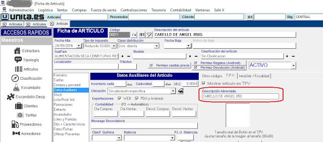 El campo Descripción Abreviada se ha traspasado ahora al menu de Datos Auxiliares, en la pestaña de TPV, para tener toda la información relevante del artículo para el TPV, en una misma pantalla