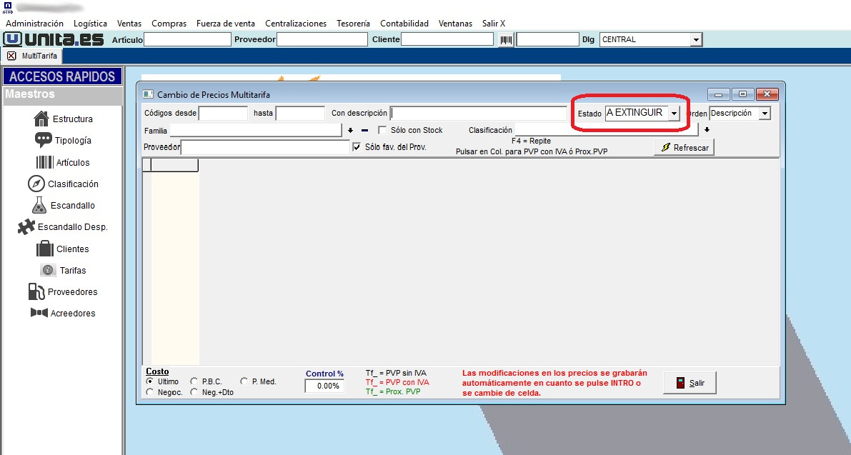 En Multitarifa se tiene la posibilidad de filtrar a aquellos articulos que tengan asociado el estado de «A extinguir»