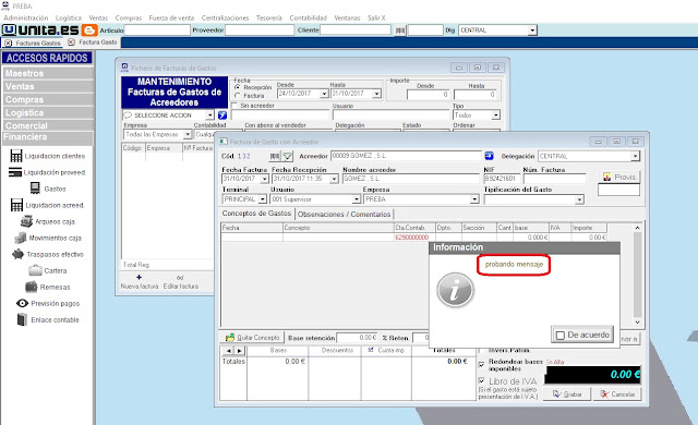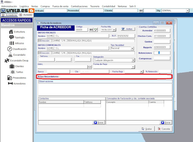 Posibilidad de poner en la ficha de cada acreedor, un mensaje que nos salga siempre que se le quiera hacer a dicho acreedor, una factura