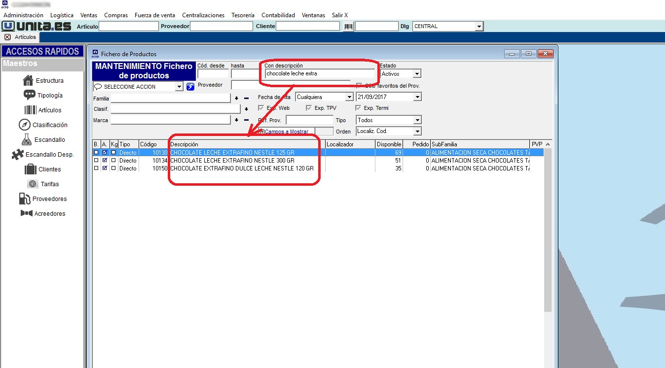 Logistica –> Articulos y Productos –> Fichero de Productos