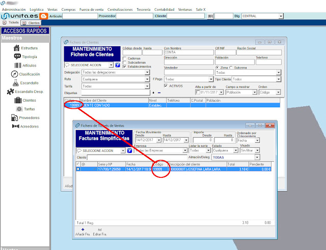 Si hemos asignado un NIF con sus datos fiscales al cliente contado (vendiendo por tickets), al irnos al mantenimiento de tickets, veremos como codigo, el codigo del cliente contado, pero como nombre , el nombre asignado.