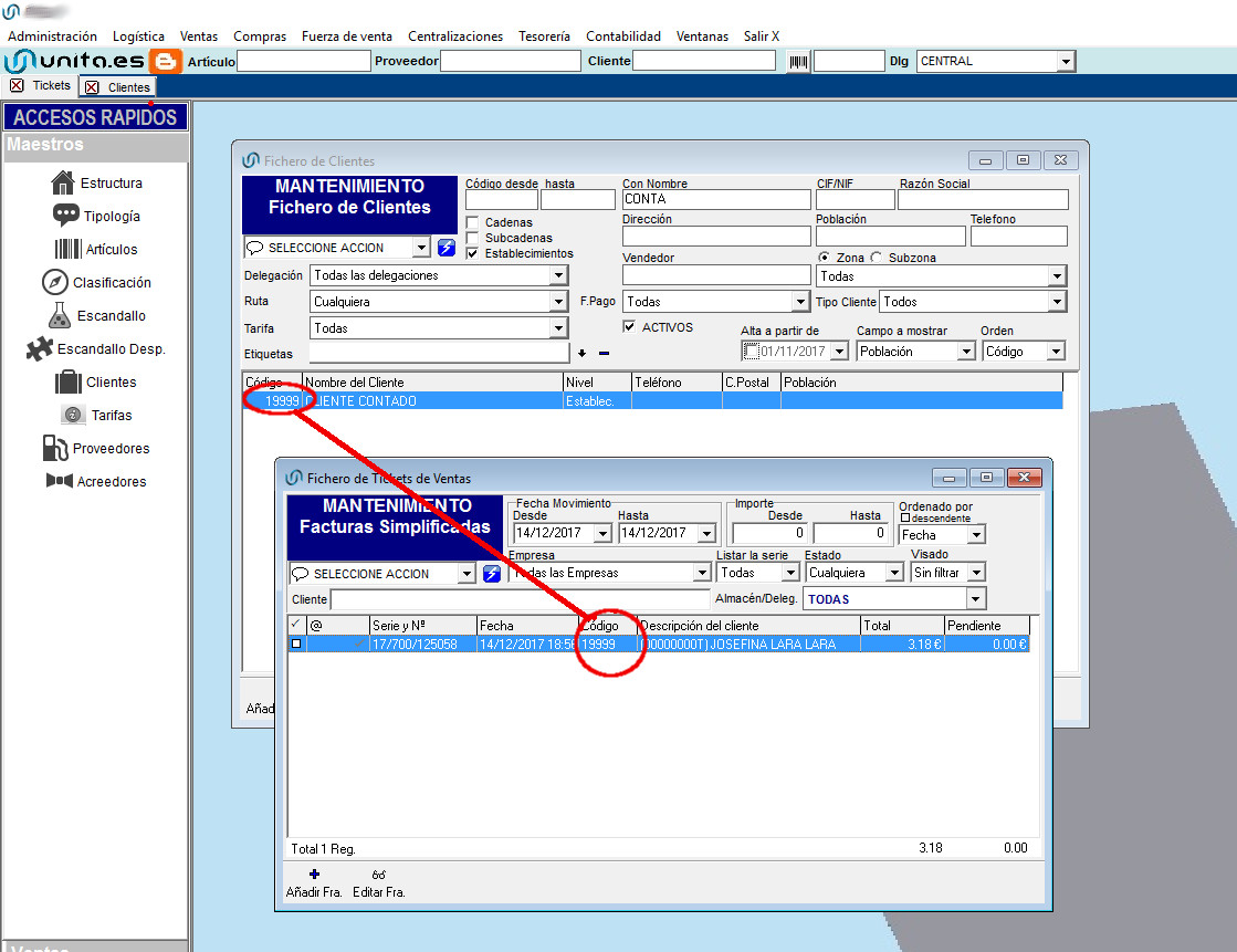 Si hemos asignado un NIF con sus datos fiscales al cliente contado (vendiendo por tickets), al irnos al mantenimiento de tickets, veremos como codigo, el codigo del cliente contado, pero como nombre , el nombre asignado.