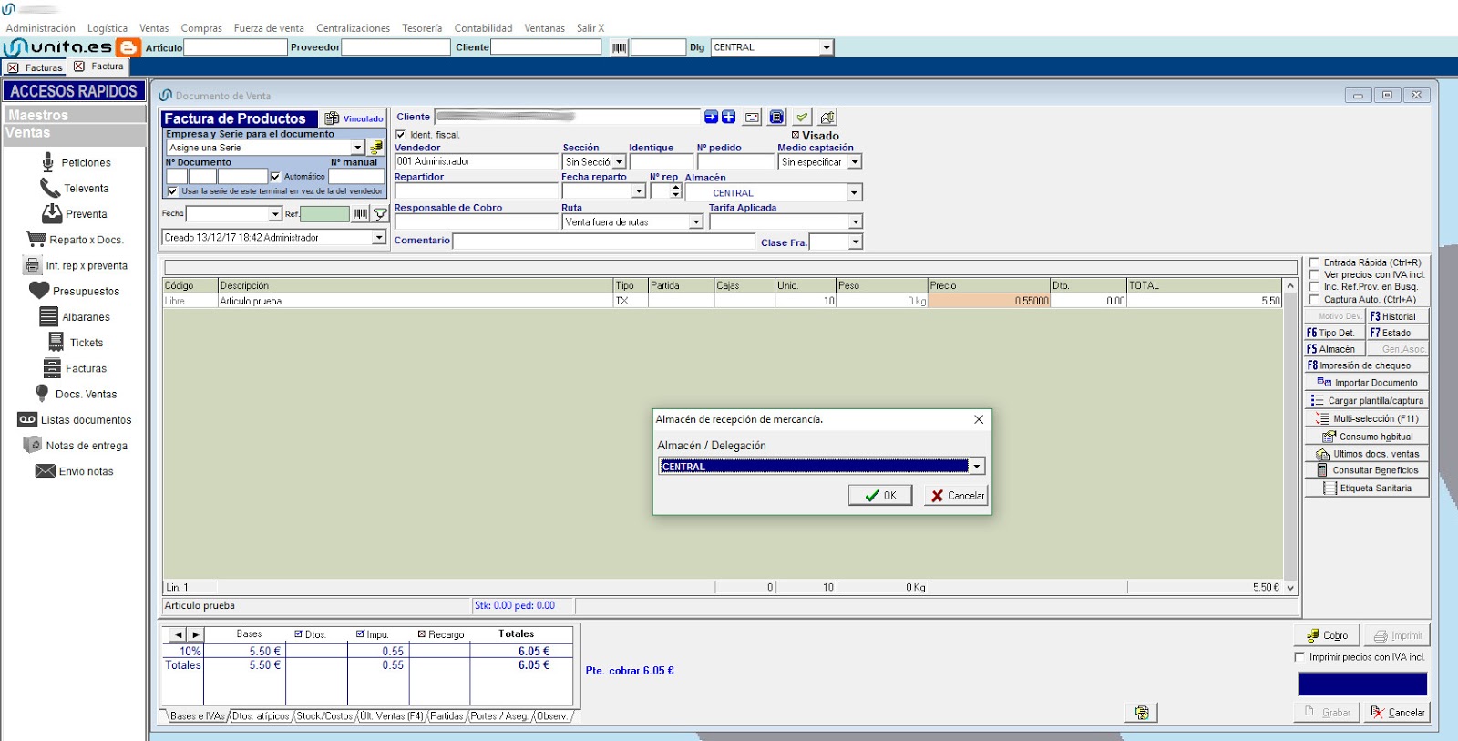 Al realizar una venta a un cliente que también es una de nuestras empresas, se genera un documento de compra para esa empresa, mostrándonos una pantalla para elegir el almacén de entrada.
