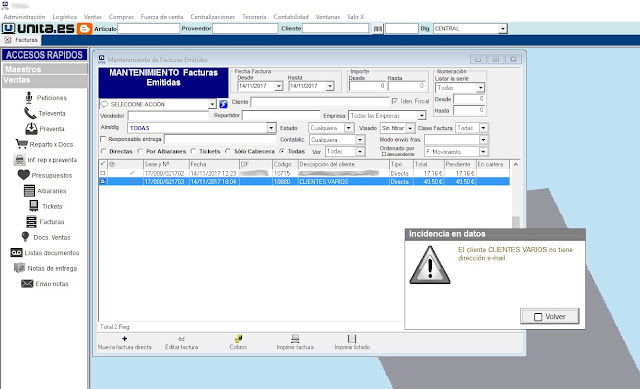 Antes de un envío masivo de facturación por correo electrónico, se informa y se descarta aquellos clientes que no tengan e-mail, para evitar «parones» durante el envío.