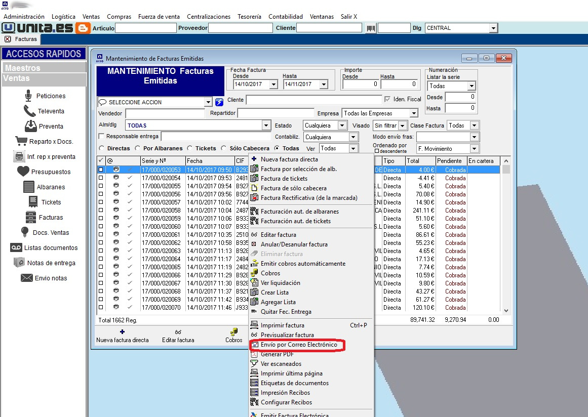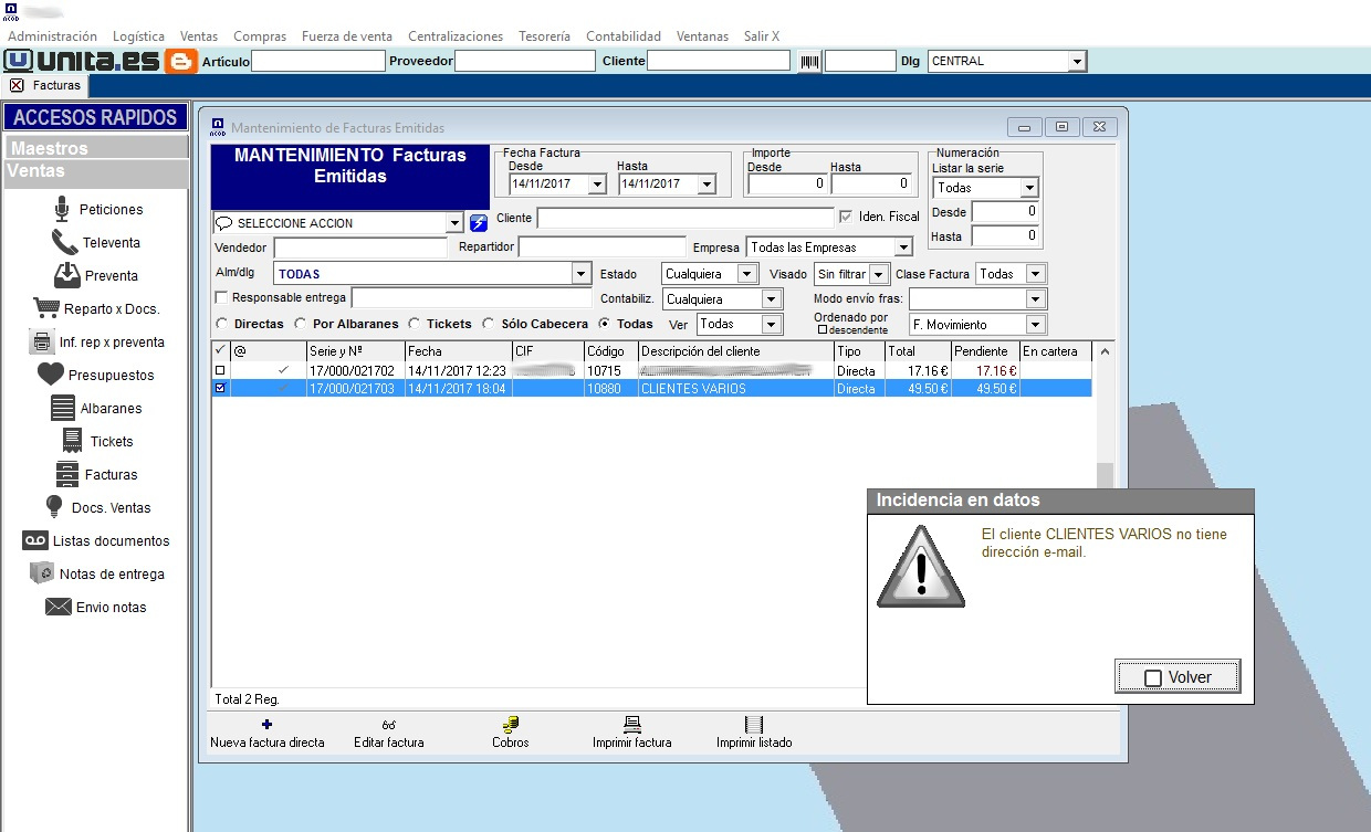 Antes de un envío masivo de facturación por correo electrónico, se informa y se descarta aquellos clientes que no tengan e-mail, para evitar «parones» durante el envío.