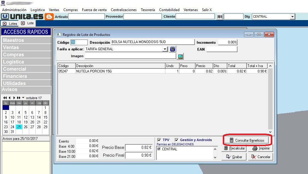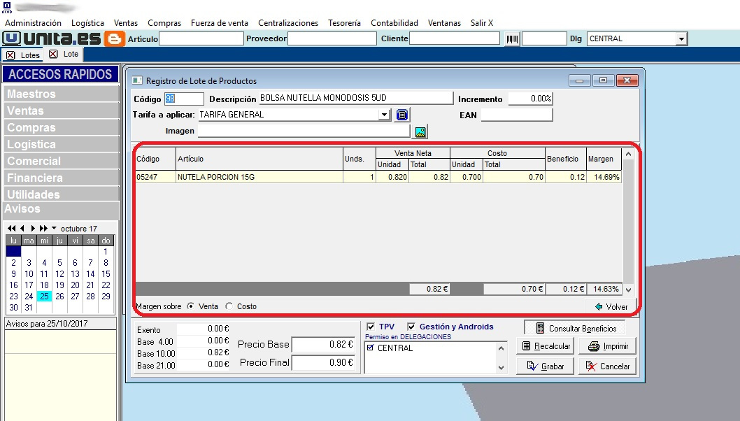 Logística –> Artículos y productos –> Fichero de Lotes de productos