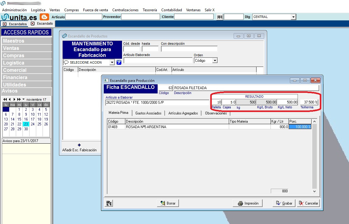 Para mayor facilidad a la hora de trabajar se han añadido los campos de palets y cajas, para calcular el peso del articulo. Así como un control sobre el peso neto resultante y la merma a aplicar.