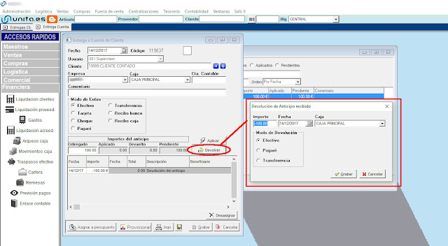 Posibilidad de hacer una devolucion total o parcial de una entrega a cuenta de un cliente que no se ha llegado a aplicar.