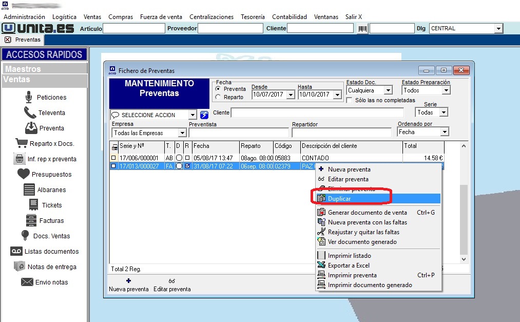 Desde el mantenimiento de preventas se podrá realizar un duplicado de una existente, pinchado con el botón derecho del ratón sobre la que se quiere duplicar y eligiendo la opción «Duplicar». Nos pedirá serie y empresa de destino