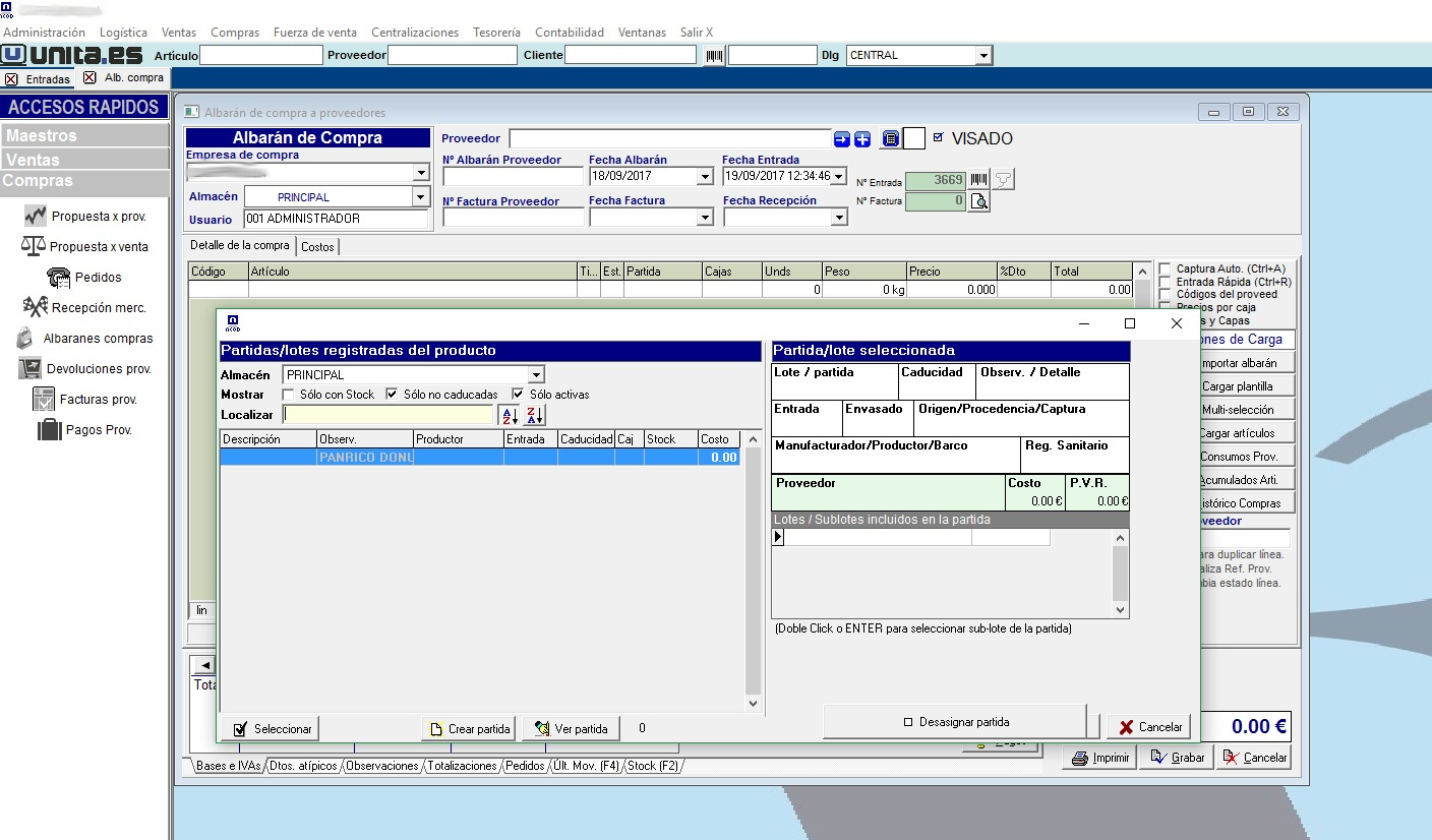 Compras –> Albaranes de compras a proveedores –> Añadir albaran –> F4 en campo partida en linea de entrada