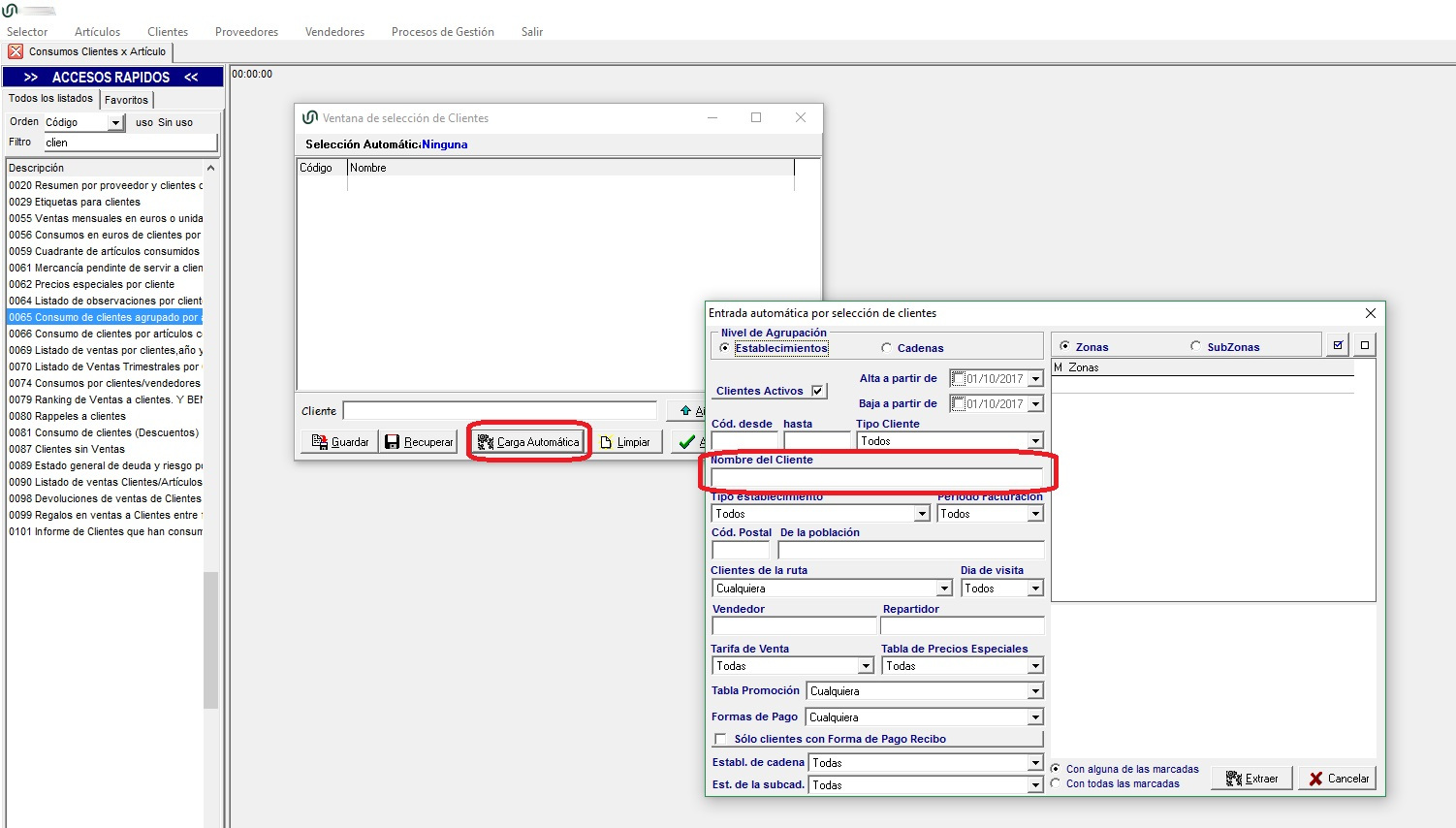 Cualquier listado con selección de clientes. Usando para seleccionar el botón de selección automática.