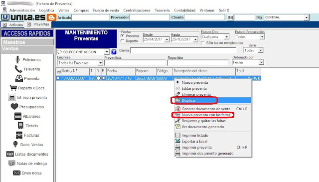 Ventas –> Gestion de Preventas –> Documentos de Preventas ….. –> Boton derecho del ratón –> Duplicar