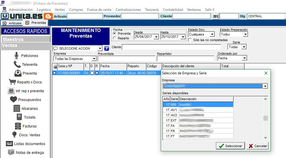 Poder elegir la serie y la empresa destinataria de un duplicado de una preventa, o de la generación de una nueva por las faltas de otra.
