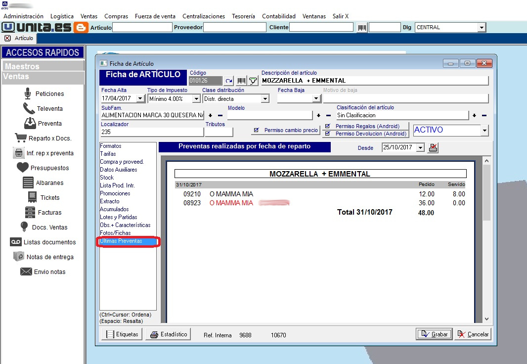 Posibilidad de ver desde el submenu de Ultimas Preventas de la ficha de artículos, los clientes a los que se les ha quedado pendiente por servir dicho articulo.