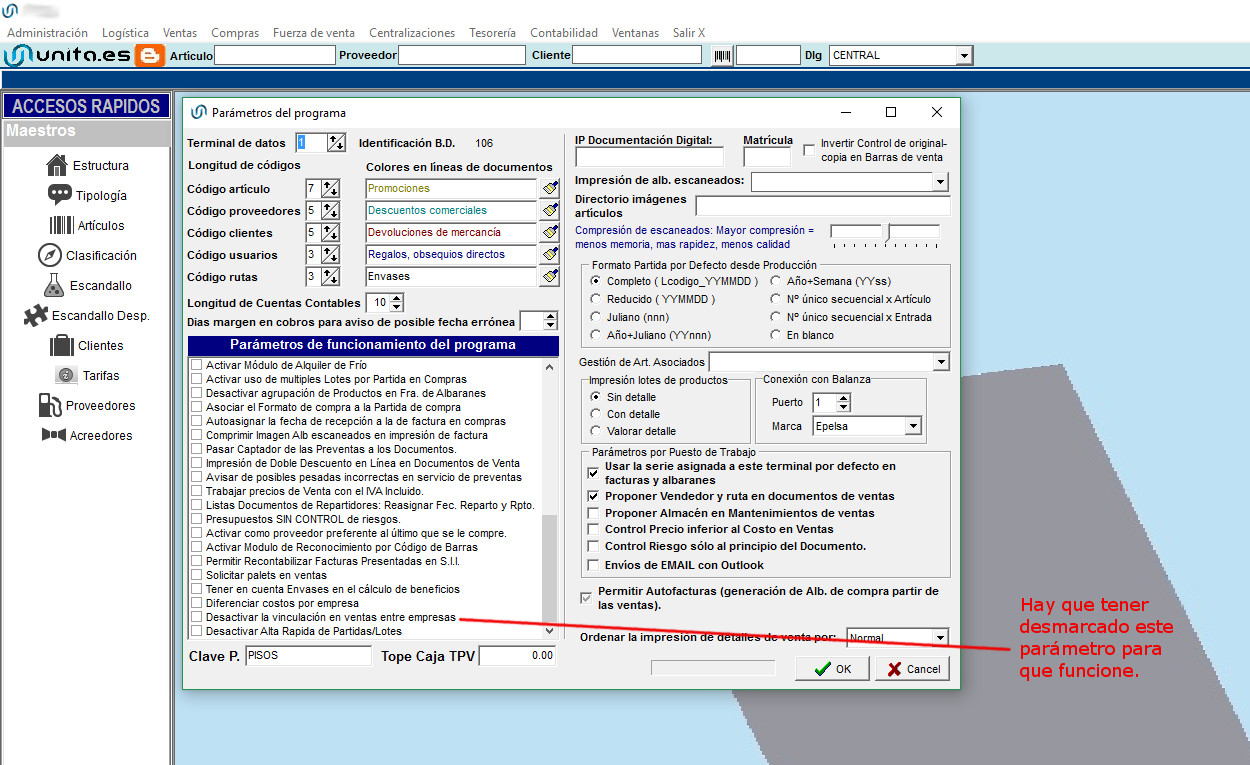 - Deseleccionar el parámetro de «Desactivar la vinculacion de ventas entre empresas». Dentro de Administración –> Configuración –>Parametros de funcionamiento