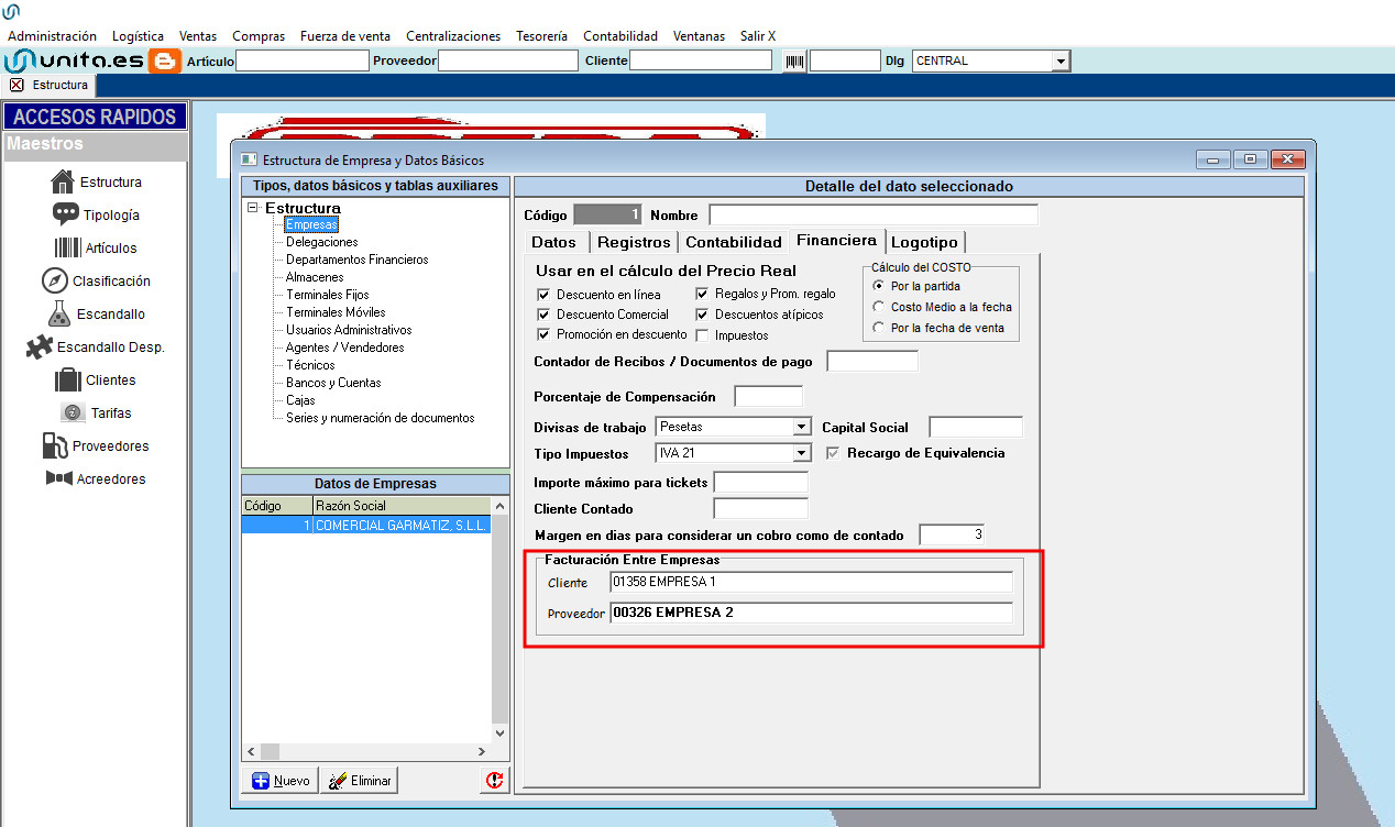 - En Administracion –> Empresa –> Estructura Comercial–> Empresas–> Financiera, tendremos que tener rellenos los campos de «Facturacion entre empresas»