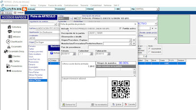 Tratamiento de códigos QR en lotes y partidas. Posibilidad de impresión en documentos de venta y etiquetas.El código recogerá toda la información introducida en su ficha.