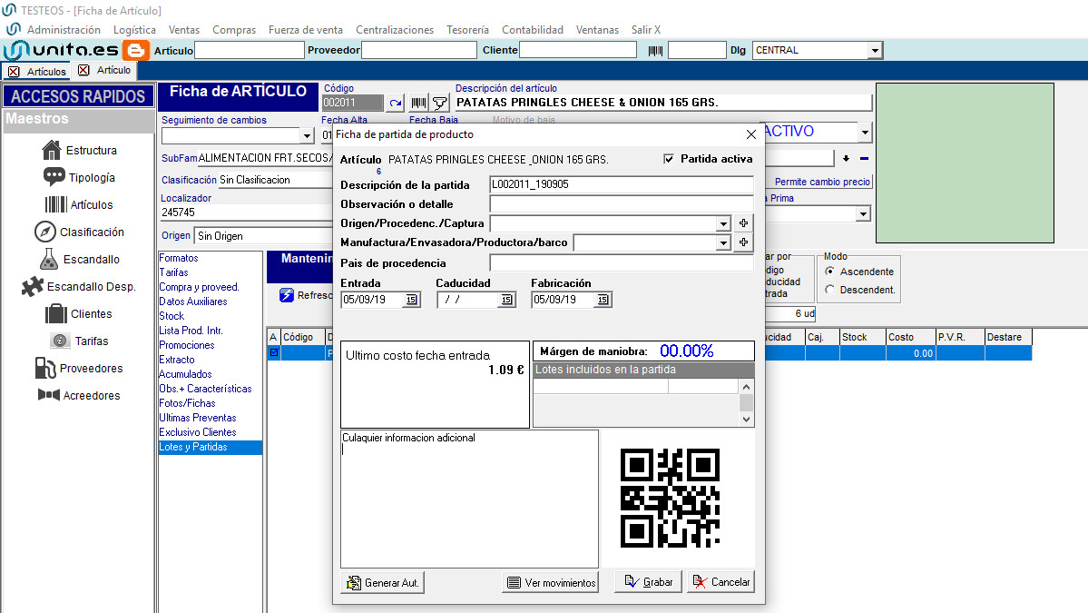 Tratamiento de códigos QR en lotes y partidas. Posibilidad de impresión en documentos de venta y etiquetas.El código recogerá toda la información introducida en su ficha.