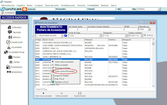 Posibilidad de pasar una ficha de acreedor a proveedor, pulsando sobre la primera con el boton derecho del ratón, en el mantenimiento de acreedores.