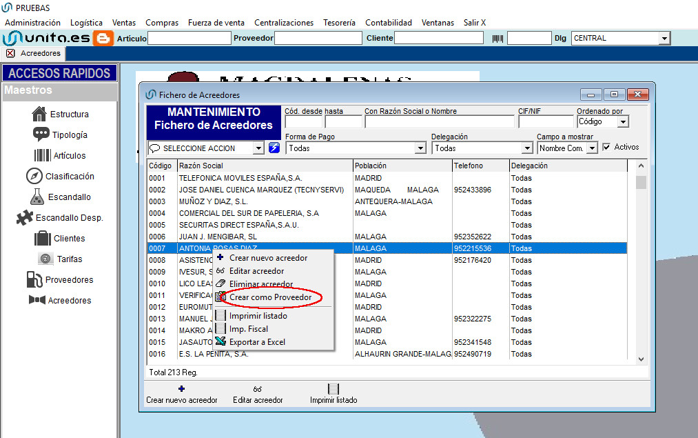 Posibilidad de pasar una ficha de acreedor a proveedor, pulsando sobre la primera con el boton derecho del ratón, en el mantenimiento de acreedores.