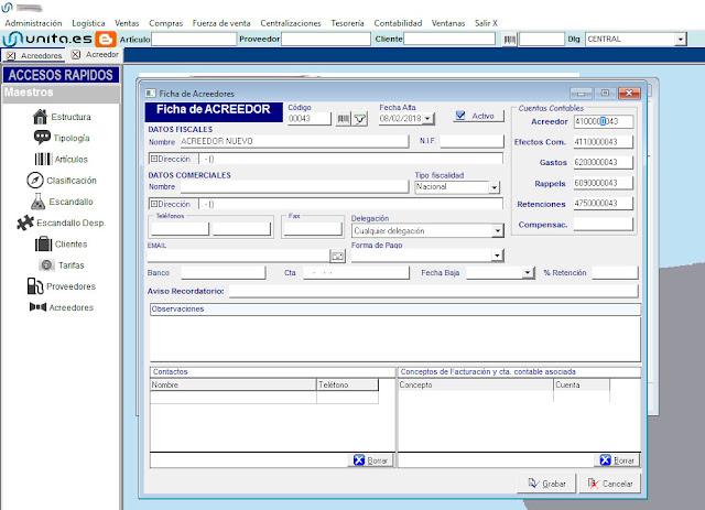 A partir de esta versión se podrán crear las cuentas contables de acreedores pulsando F2. Nos iremos a la ficha del acreedor ( si no es nueva y la estamos creando), y dentro del campo de cuenta que queramos generar, pulsaremos F2.