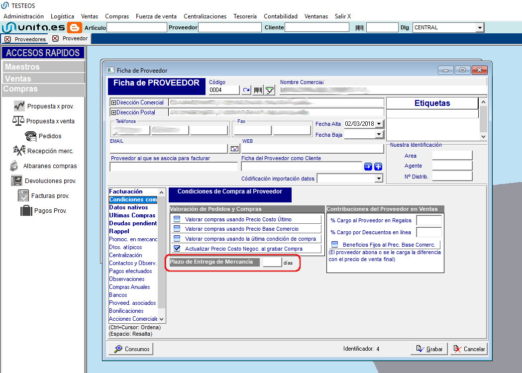 Poder especificar en la ficha del proveedor el plazo estimado de entrega de mercancía en dias, para que se asigne automáticamente una fecha prevista en los pedidos.