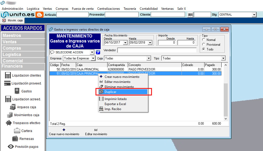 Se pueden duplicar movimientos de caja, pulsando con el botón derecho del ratón sobre el movimiento que queremos duplicar. Si son habituales, por ejemplo. Y con posibilidad de cambiar la información antes de guardar.