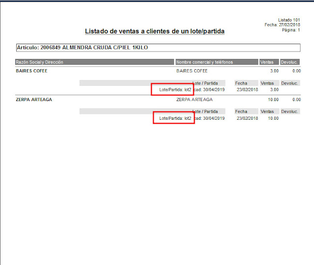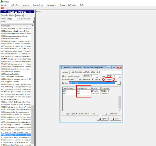 En listados 50 y 101, si hemos trabajado con sublotes, se imprimirá el sublote dejado al cliente, en vez de la partida. Cuando la partida es el lote, sigue funcionando igual (o sea se imprimirá la partida).