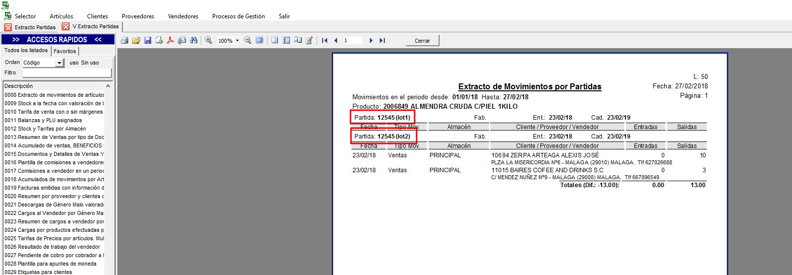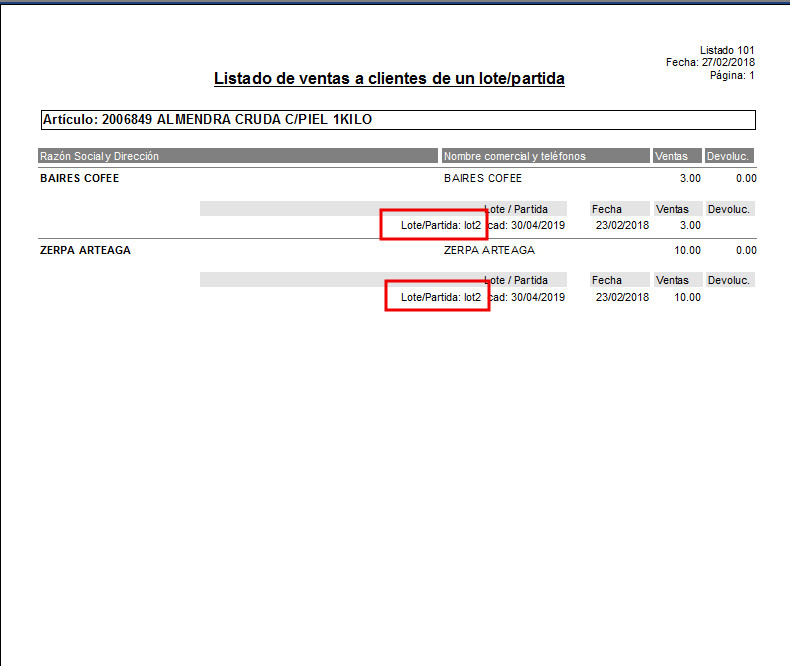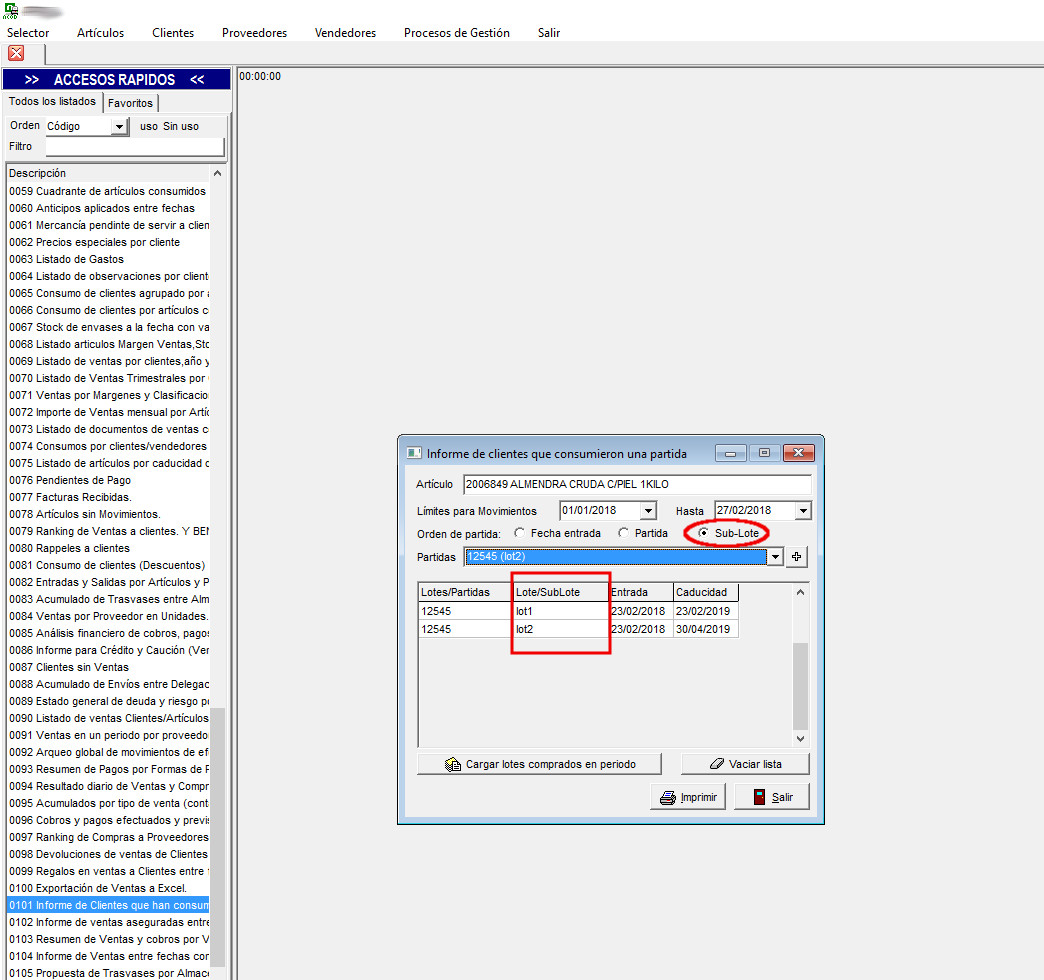 En listados 50 y 101, si hemos trabajado con sublotes, se imprimirá el sublote dejado al cliente, en vez de la partida. Cuando la partida es el lote, sigue funcionando igual (o sea se imprimirá la partida).