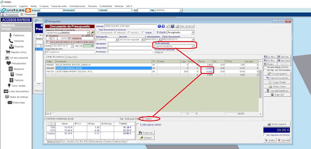 Cuando en un presupuesto a alguna linea se le aplica otra tarifa distinta a la seleccionada en la cabecera del documento, el precio de esas lineas cambia de color. Ademas se nos indicara en la parte inferior del documento que tarifa es la aplicada en esas lineas.