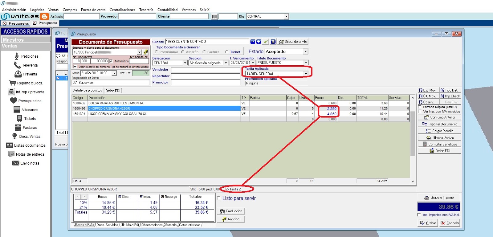 Cuando en un presupuesto a alguna linea se le aplica otra tarifa distinta a la seleccionada en la cabecera del documento, el precio de esas lineas cambia de color. Ademas se nos indicara en la parte inferior del documento que tarifa es la aplicada en esas lineas.