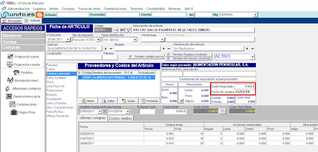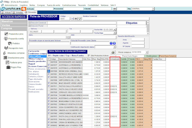 Se puede acceder desde Proveedores –> Datos Nativos, o en Articulos –> Compras