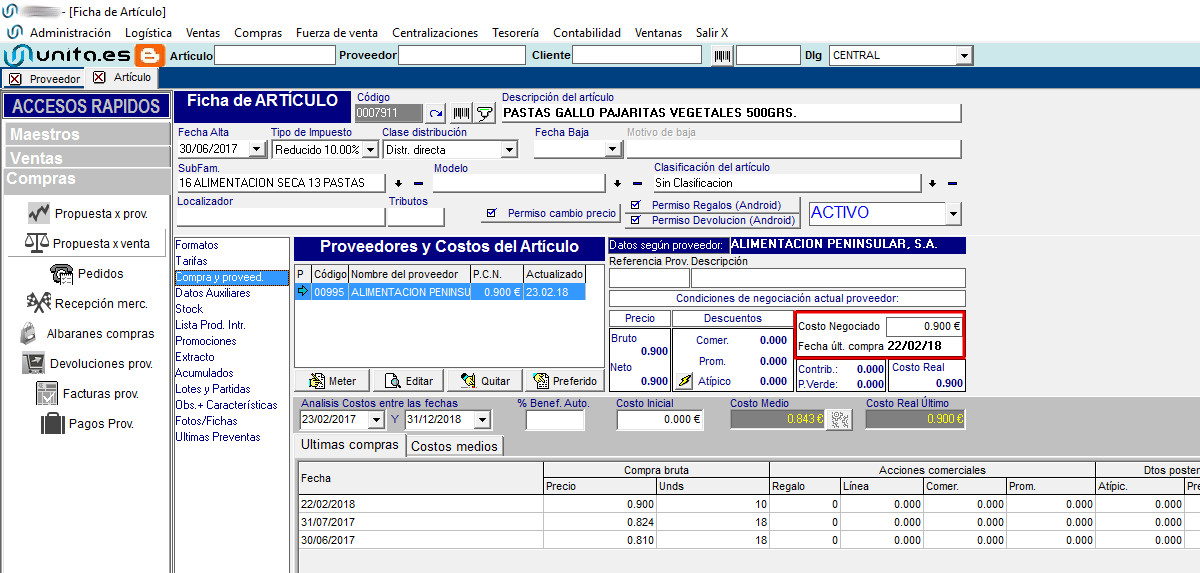 Se puede acceder desde Proveedores –> Datos Nativos, o en Articulos –> Compras