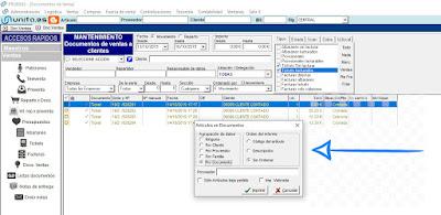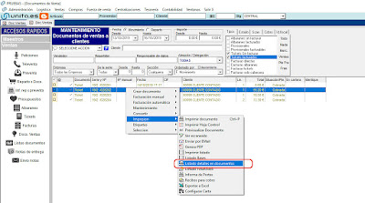 En el Mantenimiento de documentos de Ventas se ha añadido un informe de Artículos incluidos en los documentos que estén seleccionados. Cabe la posibilidad de sacarlo agrupado y valorado. Normalmente se accederá pulsando con el botón derecho del ratón sobre la pantalla del mantenimiento
