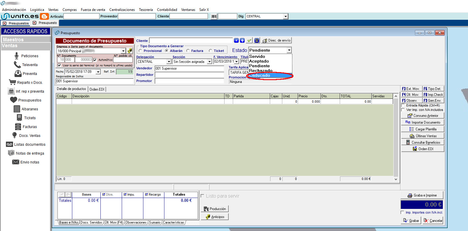 Los presupuestos cuya fecha de vencimiento haya pasado, y continuen pendientes de aceptar, pasaran automáticamente al estado de caducados.