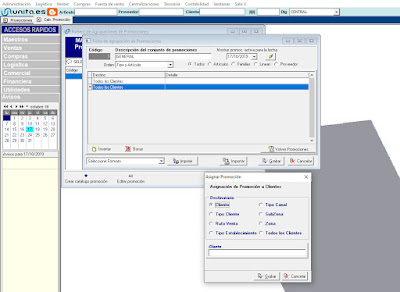 Ya no se hará desde la ficha del cliente, sino desde un menú especifico para ello. Asignaremos promociones a los distintos clientes, dentro de la misma promoción. Las promociones se podrán ejecutar sobre un articulo individual, los artículos de un proveedor, los artículos de una subfamilia o de una familia. Posibilidad de asignar a todos los clientes.