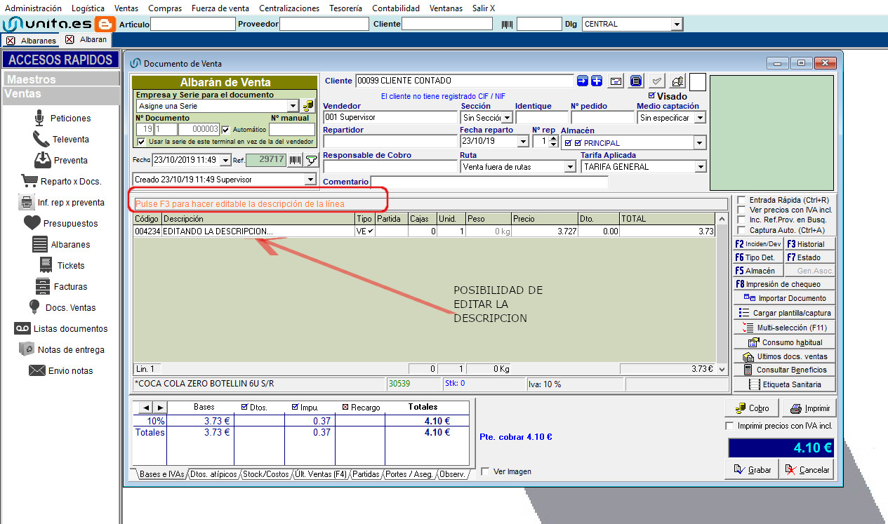 Ahora se puede editar la descripción que los artículos tienen y cambiarla, de forma puntual, por otra editada por nosotros. En cualquier documento de venta pulsando F3 cuando estamos situados en la descripción del articulo en cuestión..