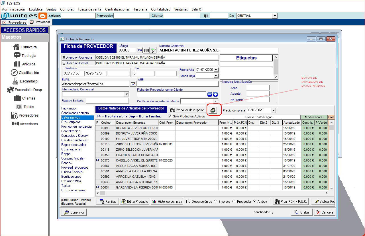 Ahora en la ficha de proveedor, en la opción de Datos Nativos , se presenta un botón para poder imprimir dicha información. Este listado sera posible configurarlo.